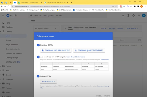 3. 打开此字段时,您将获得两个选项。第一个选项是以 CSV 文件格式下载当前用户信息或下载空白 CSV 模板,第二个选项是附加 CSV 文件,用于将新用户上传到 Google 管理控制台
