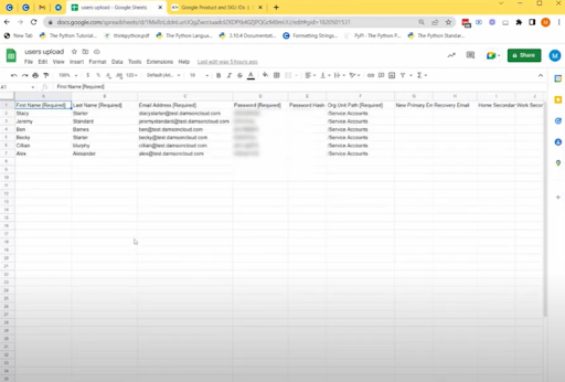 6. 现在您已经完成了将用户批量上传到 Google 管理控制台的五个必填字段,如果适用,您可以填写电子表格顶部显示的其他字段,但完成这些不是必需的。这些字段包括恢复电子邮件地址、联系电话号码、家庭住址和员工 ID 信息等信息